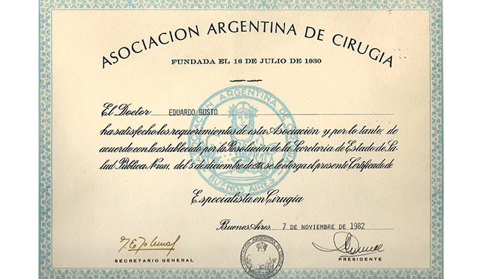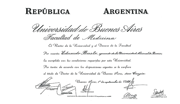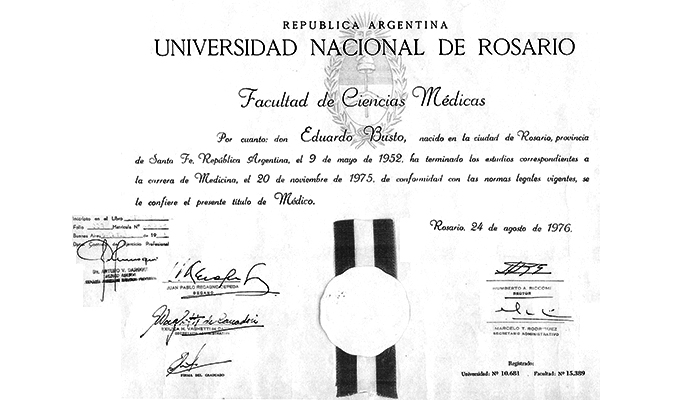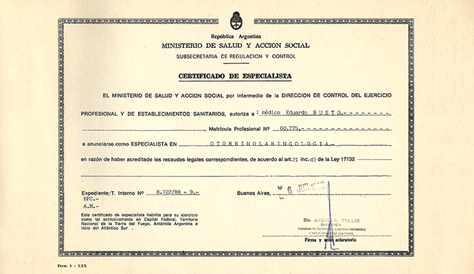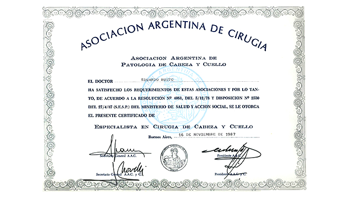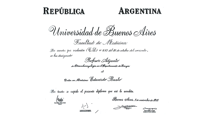 Doctor en Medicina Facultad de Ciencias Médicas Universidad Nacional de Rosario. Pcia. Santa Fe. Fecha de Ingreso: marzo de 1970. Fecha de Egreso: 20 de noviembre de 1975. - Especialista en cirugía general Colegio de Médicos de la Provincia de Santa Fe. Segunda Circunscripción. Ley 3950. Acta 833 del 20 de diciembre de 1979 - Especialista en cirugía de cabeza y cuello Ministerio de Salud y Acción Social. Resolución Nro. 4081 del 05-12-78. Disposición Nro. 2550 del 27-04-87. Noviembre, 16 de 1987 - Especialista en otorrinolaringología Ministerio de Salud y Acción Social. Subsecretaría de Regulación y Control. Expediente T. Interno Nro. 8722-88-9. Artículo 21 inc. ¨d¨. Ley 17132. Junio, 06 de 1988. - Cirujano robótico Certificate of da Vinci System Training as a Console Surgeon. Da Vinci Training Center. Temple University Hospital (TUH)- Philadelphia PA. April 8, 2015. Doctor en Medicina Facultad de Medicina. Universidad de Buenos Aires. 9 de marzo de 1999. - Tesis de doctorado Plan de Tesis titulado “Utilidad actual de los colgajos músculo-cutáneos en la cirugía reconstructiva de cabeza y cuello por tumores”. Aceptado por el Consejo Directivo de la Facultad de Medicina el 10 de agosto de 1995. Expediente N* 505.999/95. - Trabajo de Tesis titulado “Utilidad de los colgajos músculo-cutáneos en la cirugía reconstructiva de cabeza y cuello por tumores”. Presentada Expediente N* 505.999/95. Tesis Aprobada: “Utilidad de los colgajos músculo-cutáneos en la cirugía reconstructiva de cabeza y cuello por tumores”. 9 de marzo de 1999. Carrera docente - Profesor adjunto Departamento Académico de Clínica Quirúrgica del Instituto Universitario. Escuela de Medicina del Hospital Italiano de Buenos Aires. Resolución del Rector Nº 62/08 del 7 de mayo de 2009. - Profesor regular adjunto Facultad de Medicina. Universidad de Buenos Aires. Resolución 697 del 4 de junio de 2010. Universidad de Buenos Aires. Trayectoria en la actividad hospitalaria - Subjefe del servicio de otorrinolaringología Hospital Italiano de Buenos Aires. Desde el año 2012. Actividad docente de postgrado - Subdirector de la carrera de especialización en otorrinolaringología 271 relatos en Carrera Universitaria.