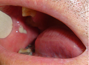 Saliva purulenta drenando por el orificio de desembocadura del conducto de Stensen.