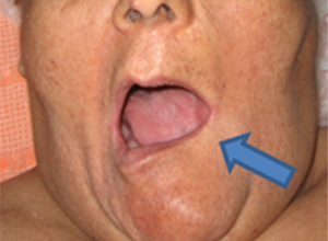 Parálisis de la rama Marginal Mandibular del nervio Facial (lado izquierdo), por un tumor de parótida del lado izquierdo.